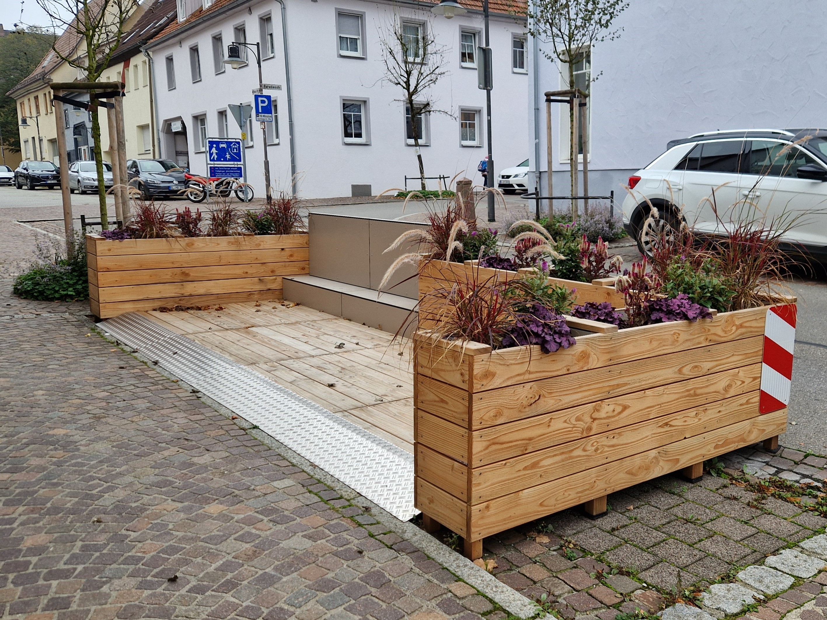 Das Amt für Stadtentwicklung hat gemeinsam mit der Zimmerei Gebrüder Dürringer GbR ein Musterparklet entwickelt. Das Parklet war in der Saison 2024 in der Neuen Straße 53 vor dem Geschäft BASTA zur Ansicht aufgebaut. Am Musterparklet wird anschaulich dargestellt, wie die Gestaltungsrichtlinie baulich umgesetzt wird.