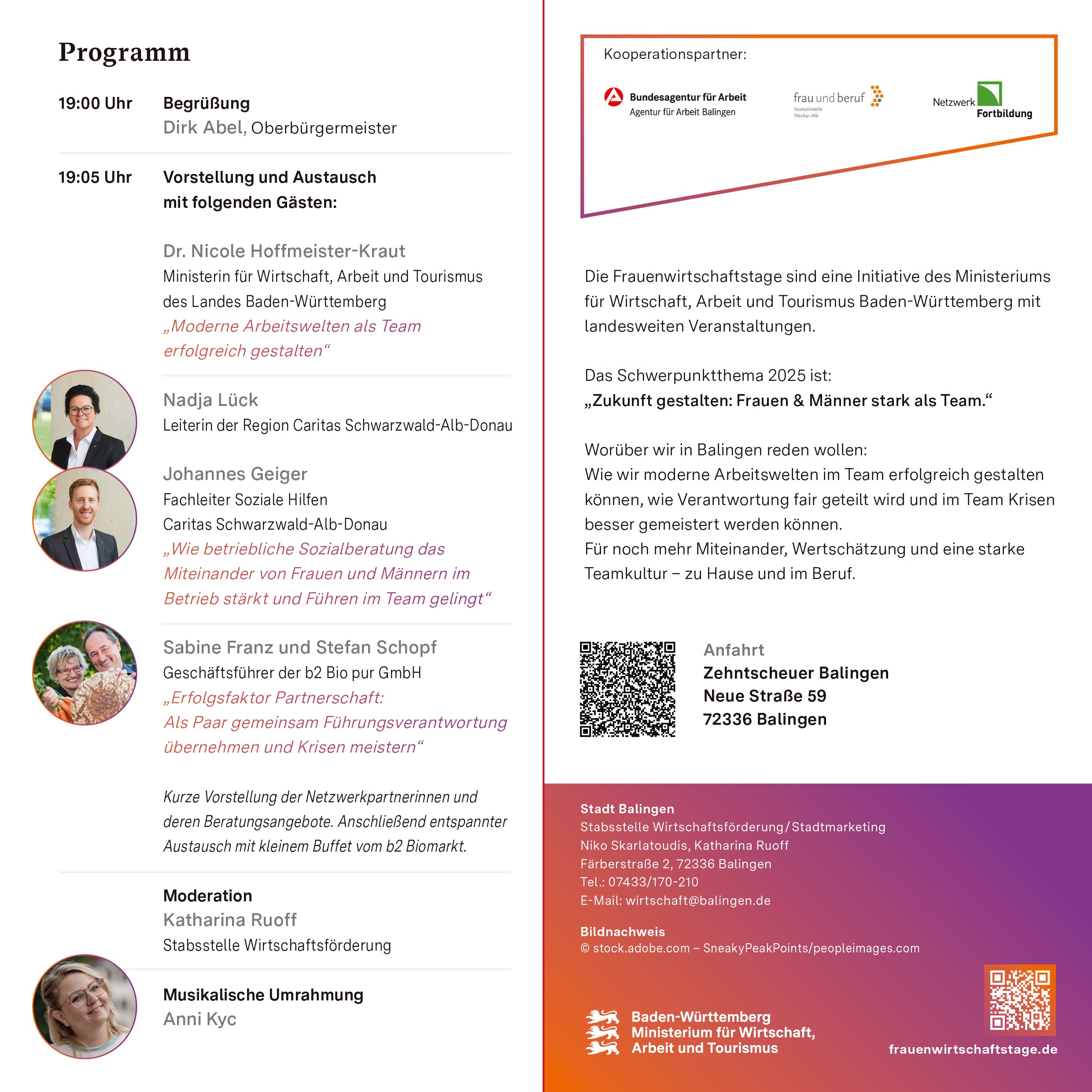 Die Stabsstelle Wirtschaftsförderung der Stadt Balingen beteiligt sich in Kooperation mit der Agentur für Arbeit Balingen und anderen kommunalen und regionalen Partnern mit einer eigenen Veranstaltung an den Frauenwirtschaftstagen des Ministeriums für Wirtschaft, Arbeit und Tourismus Baden-Württemberg.