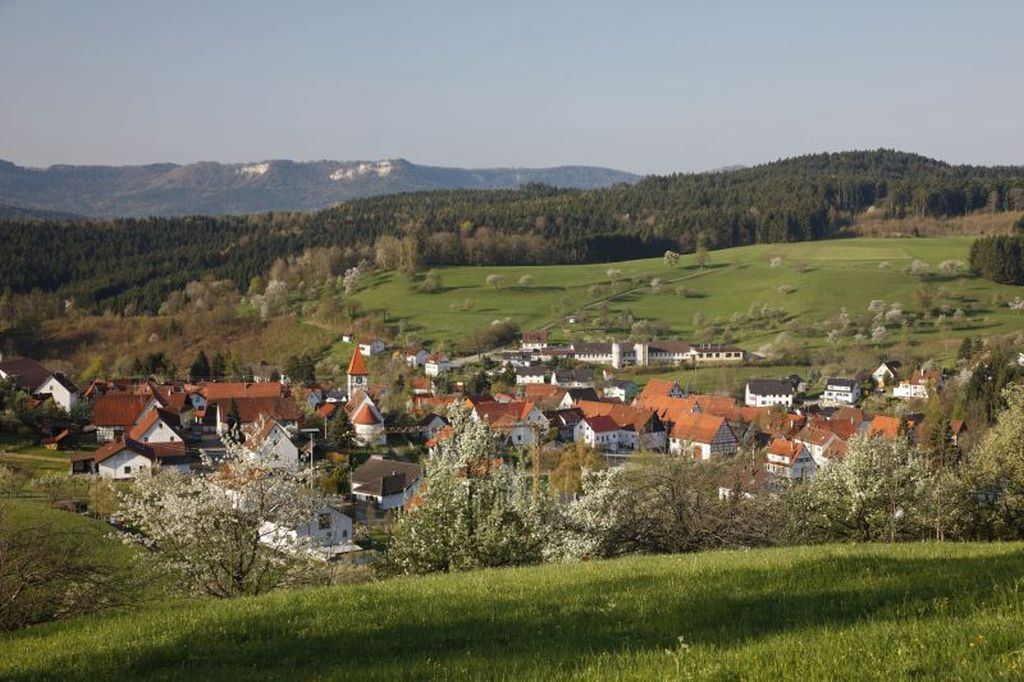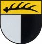 Wappen: Das Schildhaupt symbolisiert die Zugehörigkeit zu Württemberg ab 1403, die Farben Schwarz und Silber diejenige zu Hohenzollern vor 1403.