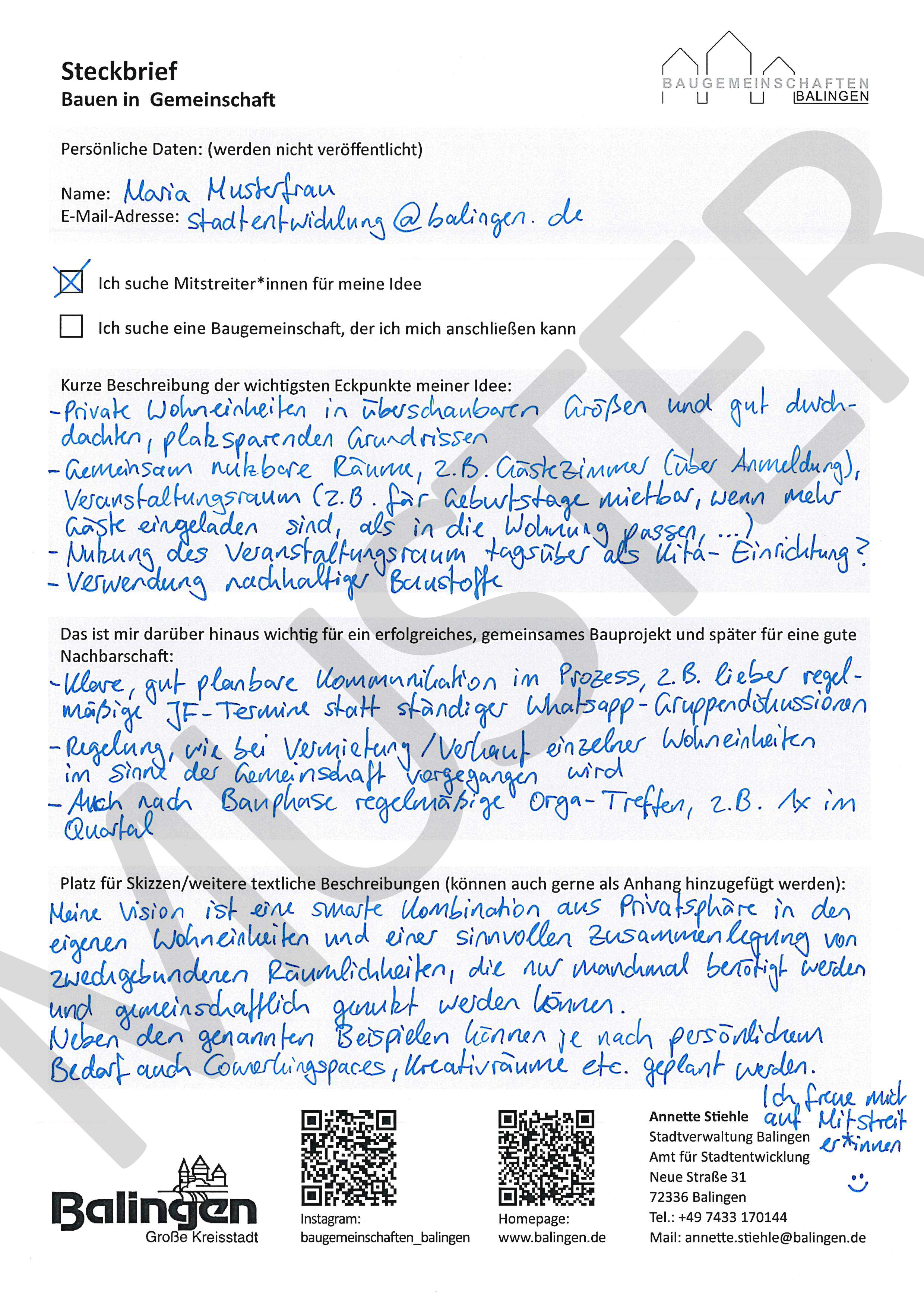 Sie haben eine Konzeptidee und suchen weitere Mitstreitende, die sich ebenfalls für Ihre Idee begeistern? Dann stellen Sie diese gerne dar - ob in textlicher, zeichnerischer oder sonstiger Form bleibt Ihnen überlassen. Gerne können Sie unseren Steckbrief-Vordruck herunterladen (1,9 MB), ausfüllen und uns zusenden. Das ausgefüllte Dokument sowie eventuell vorhandene Anhänge können Sie uns gerne unter dem Betreff "Baugemeinschaften" an stadtentwicklung@balingen.de schicken. Die Einsendungen werden dann hier auf der Homepage veröffentlicht, sodass potentielle Projektpartner*innen sich über Ihre Idee informieren und ggf. Ihr Interesse bekunden können.