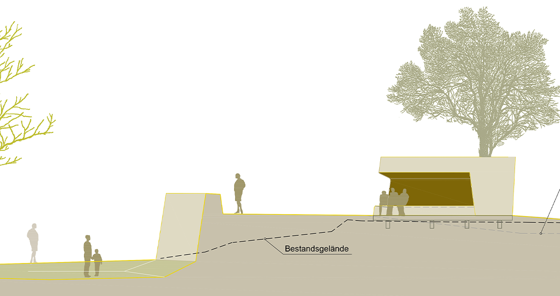 Die Ausrichtung des überdachten Betonmöbels lenkt den Blick auf die Steinach und insbesondere auf den Mündungsbereich in der Eyach. Der Steg zwischen Rappenturm und Viehmarktplatz wird neu gebaut und durch einen deutlich größeren Übergang ersetzt. So können Sie beim Spazieren an der Eyach gezielt einen Abstecher zu diesem historisch spannenden Bereich machen, der bislang weder sichtbar noch nutzbar war.