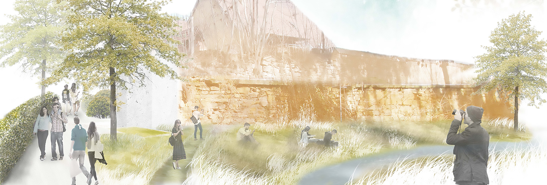 Um Konflikte mit dem Denkmalschutz zu vermeiden, wird die Installation über dem anstehenden Gelände erstellt. Das Baumaterial – grob gestockter Beton – lässt deutlich erkennen, dass es sich bei den Mauern um Neubauten handelt, die sich von den umliegenden historischen Stadtmauern abheben. Die alten Mauerteile werden für die Gartenschau Balingen 2023 denkmalkonform saniert.