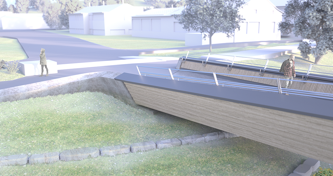Die Jury entschied sich für die Trog-Brücke des Ingenieurbüros Miebach: eine effektive, kostensparende Holzkonstruktion. Das Tragwerk liegt hier nicht wie bei anderen Konstruktionsarten unterhalb des Gehbelags. Dadurch bleibt der Hochwasserquerschnitt unter der Brücke frei von Elementen wie Trägern oder Stützen. Die Neigung der Träger gewährleistet außerdem den konstruktiven Holzschutz, die Wartungskosten fallen gering aus. Durch die Ausbildung eines Troges bilden die seitlichen Wangen Konstruktion und Geländer in einem.