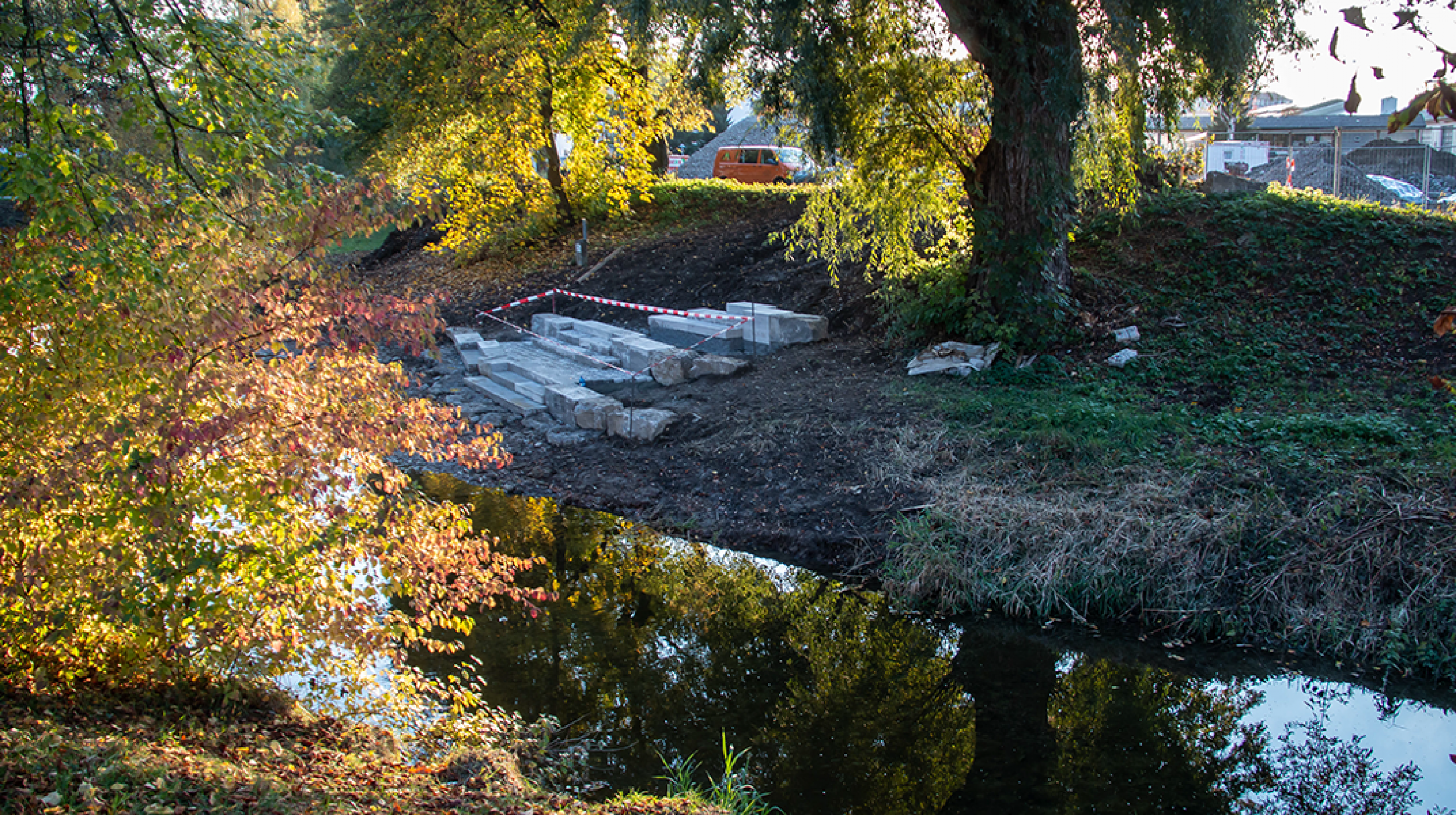 Die gegenüberliegende Einmündung des Reichenbachs in die Eyach wird durch eine naturnahe Umgestaltung ökologisch aufgewertet: Der Sohlverbau wird entfernt, um die natürliche Funktion des Flussbetts wiederherzustellen. Der Absturz an der Mündung wird in eine Fischtreppe umgebaut, um den schwimmenden Eyachbewohnern beim Übergang zu helfen – ein Wanderweg für Fische.