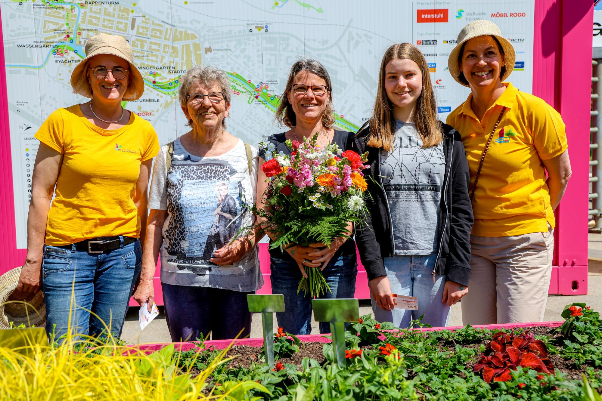 Zu unzähligen schönen Momenten kam jetzt ein weiterer beim Zusammentreffen mit der Meilensteinbesucherin dazu: Die Winterlingerin Anneliese Fiebig war mit ihrer Tochter Sabine Burth und Enkelin Anna Marie aus Ablach (Krauchenwies) nach Balingen gekommen, um die Gartenschau kennenzulernen; das Team überraschte die Familie mit einem Blumenstrauß und einem Gutschein für die Gastronomie auf dem Gelände.