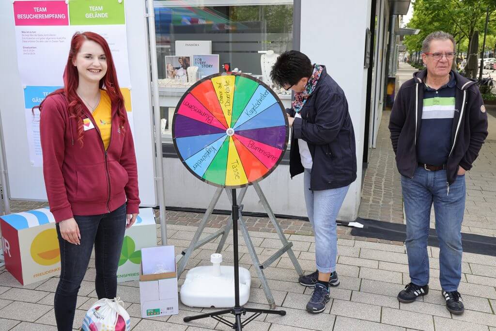 Beim Glücksrad gab es die Chance auf eine Dauerkarte und andere kleinere Gewinne, wie Gartenschau-Aufkleber, Tassen, Samenbeutel, Kulis und Bleistifte.