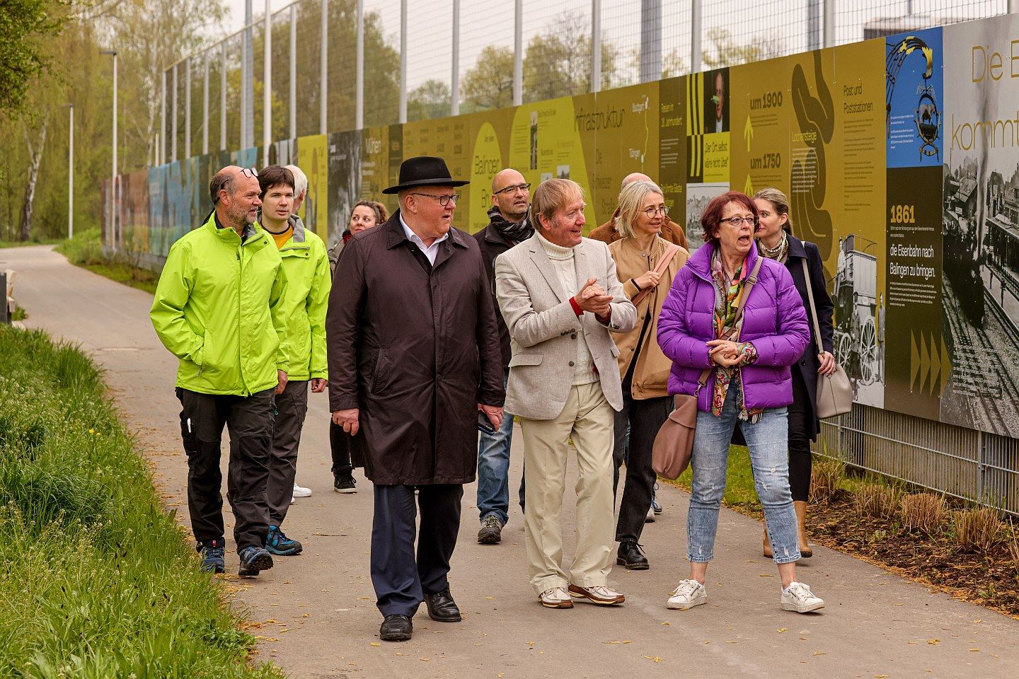 Mai 23: Pünktlich mit Start der Gartenschau lockt Balingen mit einer weiteren neuen Attraktion: An dem Zaun, der sich vor kurzem noch unauffällig hinter der Bizerba-Arena entlangzog, leuchten zur Uferseite hin jetzt die farbenfrohen Schautafeln des Historischen Pfads, der auf 250 Metern Länge die Stadtgeschichte illustriert – frei zugänglich für jedermann.
