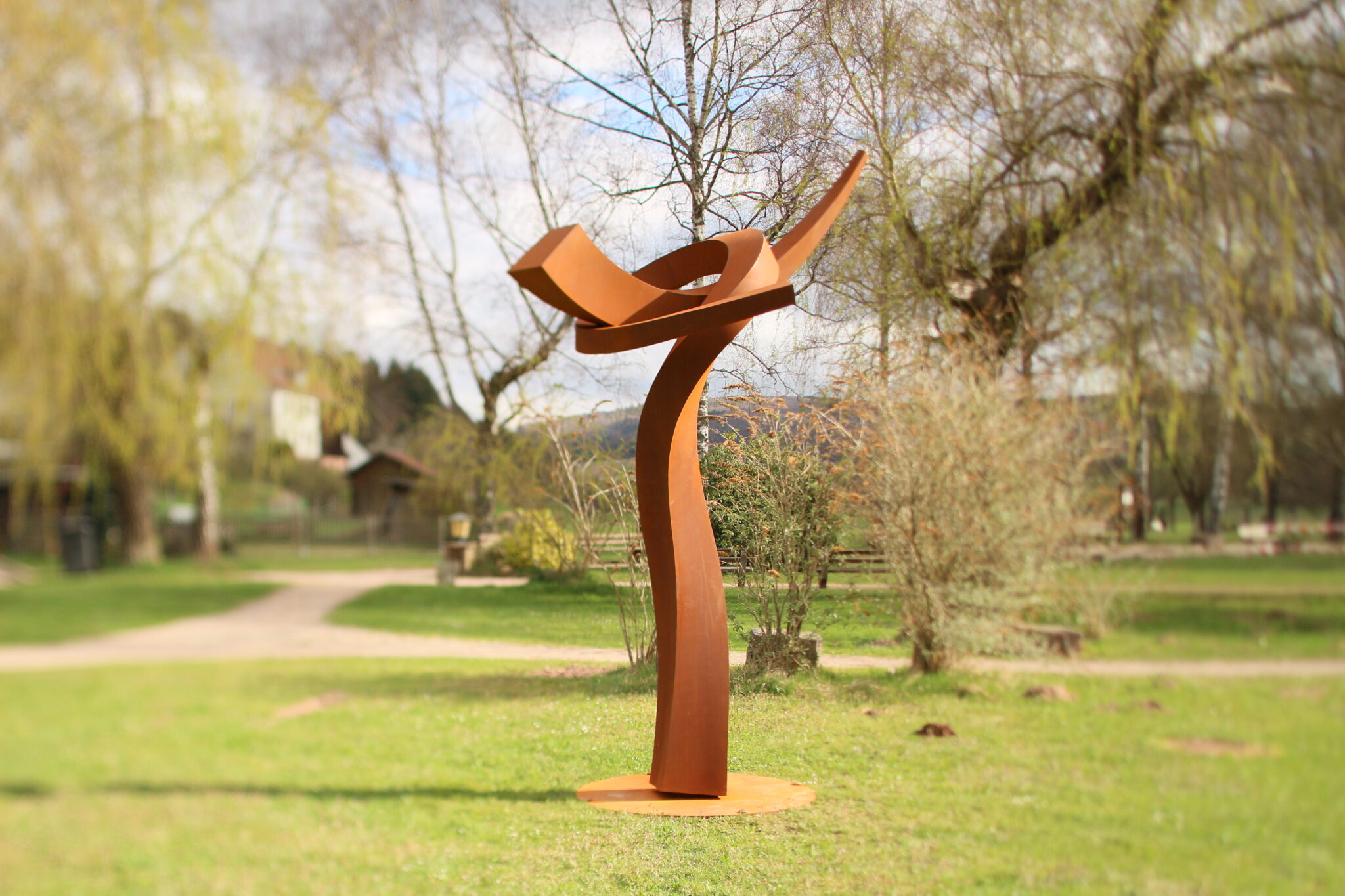 Geschweißte Bronzeplatten lassen noch das heiße Metall erkennen, das mit Ziseliereisen und Polierwerkzeugen bearbeitet wurde. Das Patinieren ist ein weiterer und wichtiger Schritt der Vollendung und nimmt den natürlichen Vorgang der Oxidation vorweg. Dafür trägt Basilius Kleinhans eine eigene Rezeptur der Patinier-Lösung auf, die danach mit der Gasflamme eingebrannt wird.