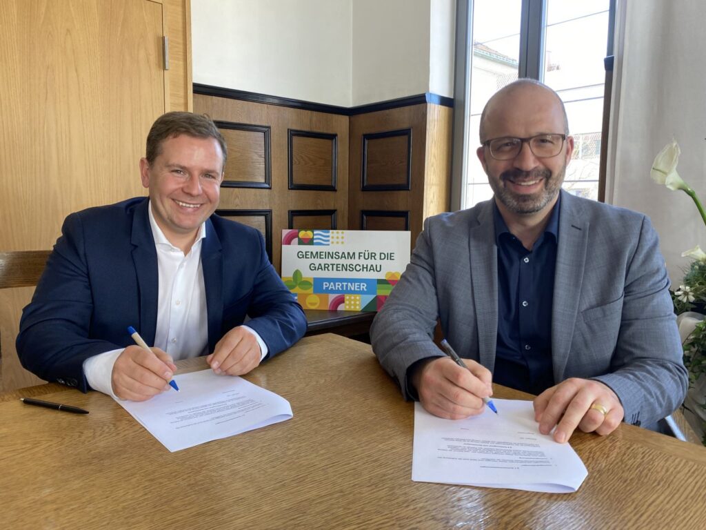 Apr. 23: Der bunte Gartenschaubus fährt schon seit geraumer Zeit durch Balingen, jetzt ist Maas Reisen ganz offiziell an Bord des Gartenschauteams: Bürgermeister Ermilio Verrengia und Thomas Maas unterzeichneten vor kurzem den Partnerschaftsvertrag. Der bringt noch mehr ins Rollen.