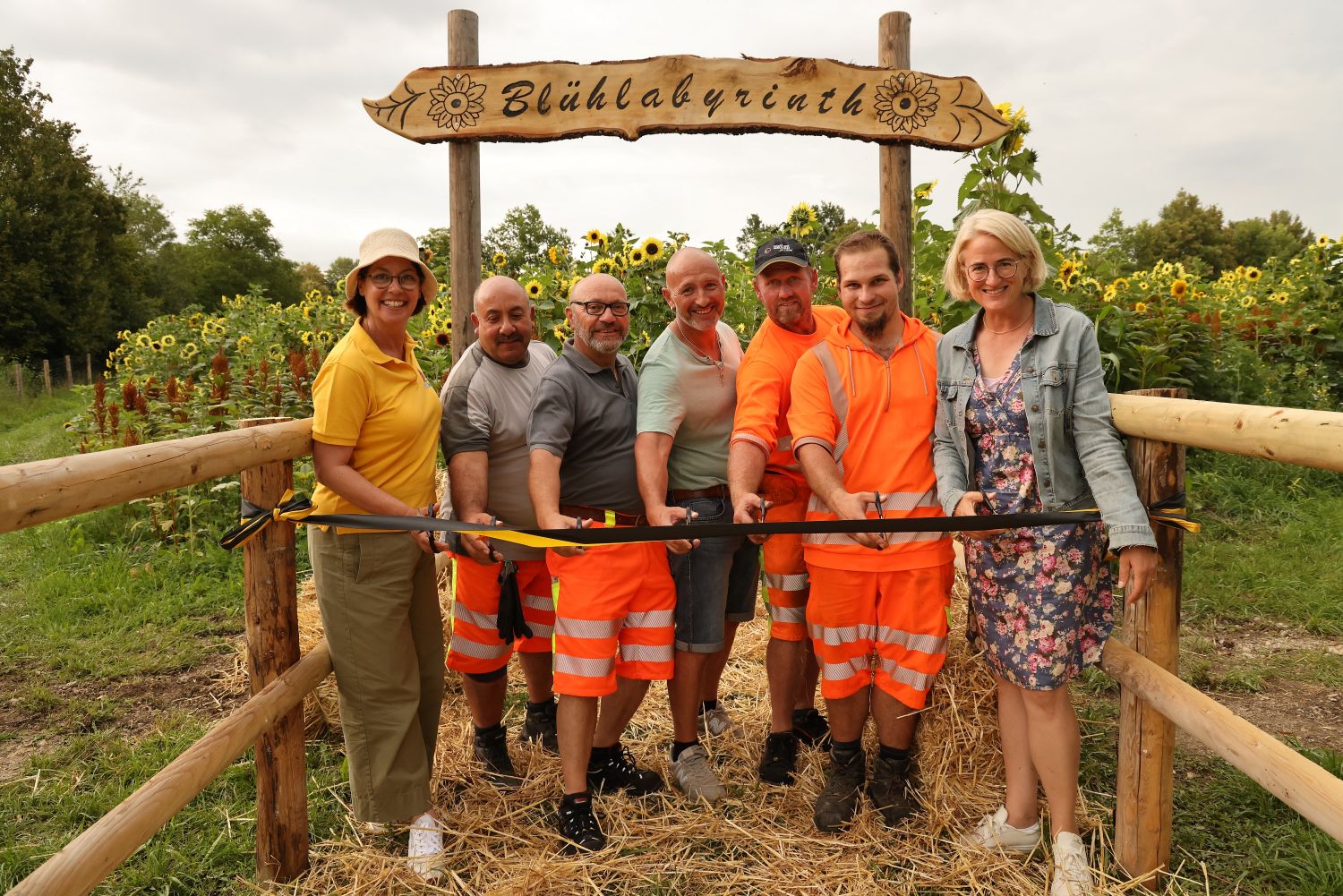 Ein großer hölzerner Bogen kennzeichnet den Eingang, dahinter windet sich ein schmaler Pfad ins Grüne, gesäumt von strahlendem Gelb – ein einladender Anblick, der prompt die ersten Besucher ins Blühlabyrinth lockt. Und auch das Gartenschauteam ist begeistert von der neuen Attraktion. „Ich freue mich besonders, dass wir jetzt einen schönen Ausstellungsbeitrag mit Sonnenblumen haben, die auf Gartenschauen auch immer ein beliebtes Thema sind“, sagt Annette Stiehle. Die Technische Geschäftsführerin eröffnete das Blühlabyrinth gemeinsam mit Annette Stoll-Zeitler, Leiterin des Fachbereichs Ausstellung und Betrieb, sowie Bauhofbetriebsleiter Marc Pfeilmayer mit seinem Team.