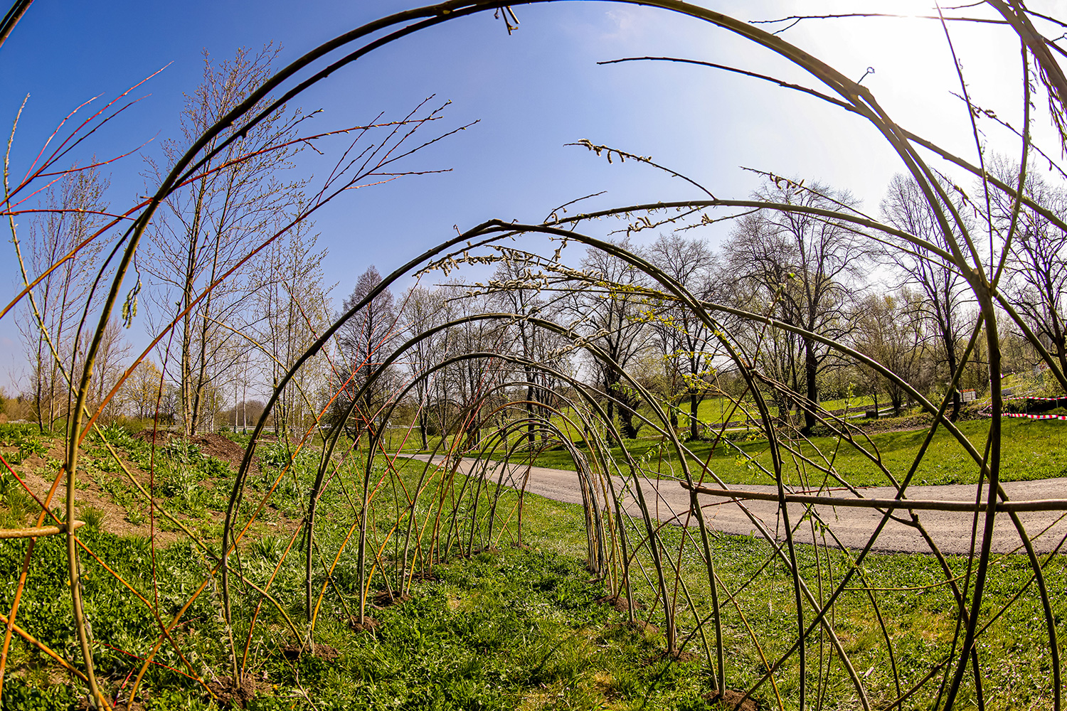 Eine Vielzahl an Weidenruten konnten gesteckt werden. Nun schmiegt sich sichtbar ein Weidentunnel an den Hügel und endet in einem Dom.
