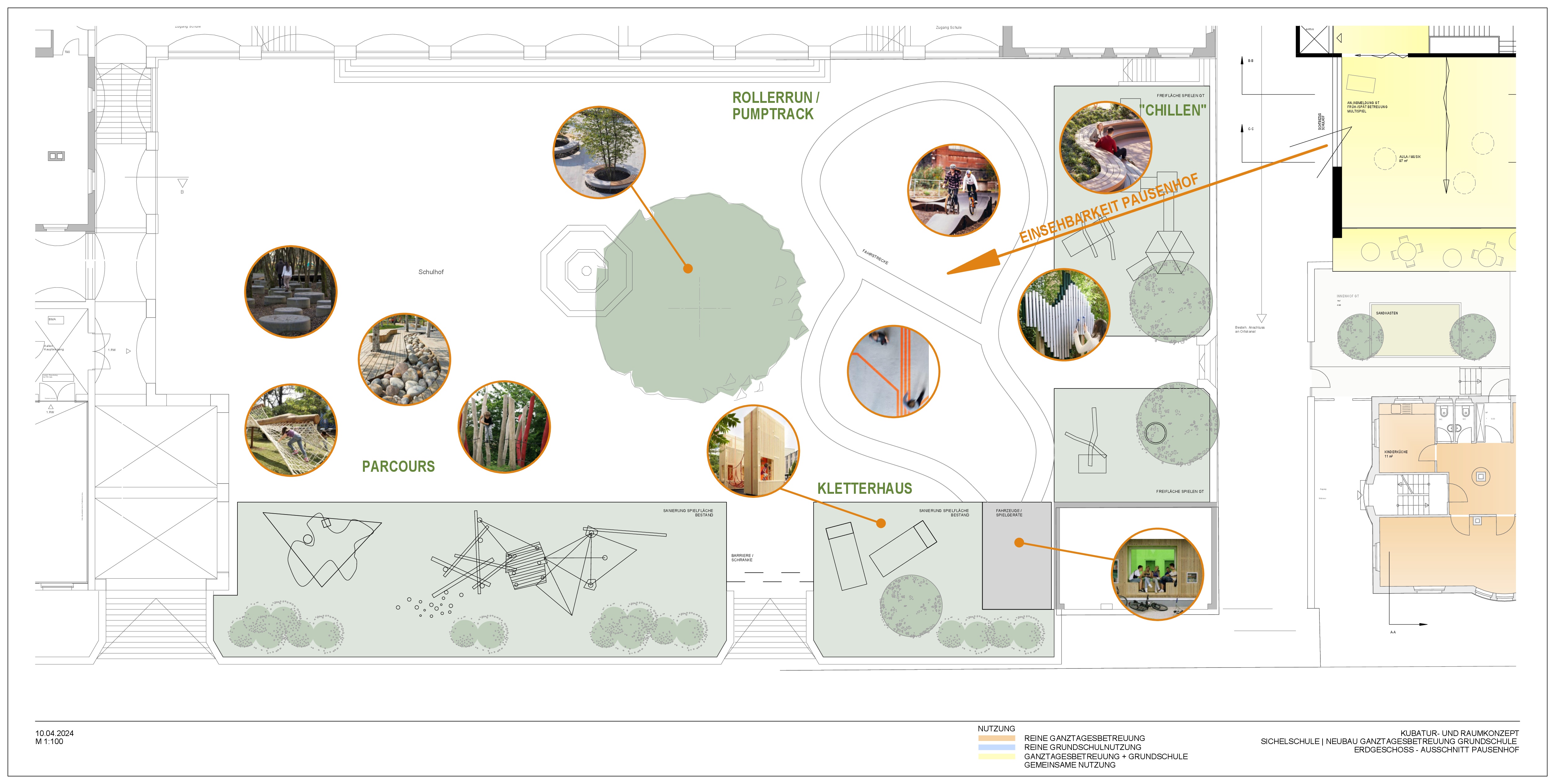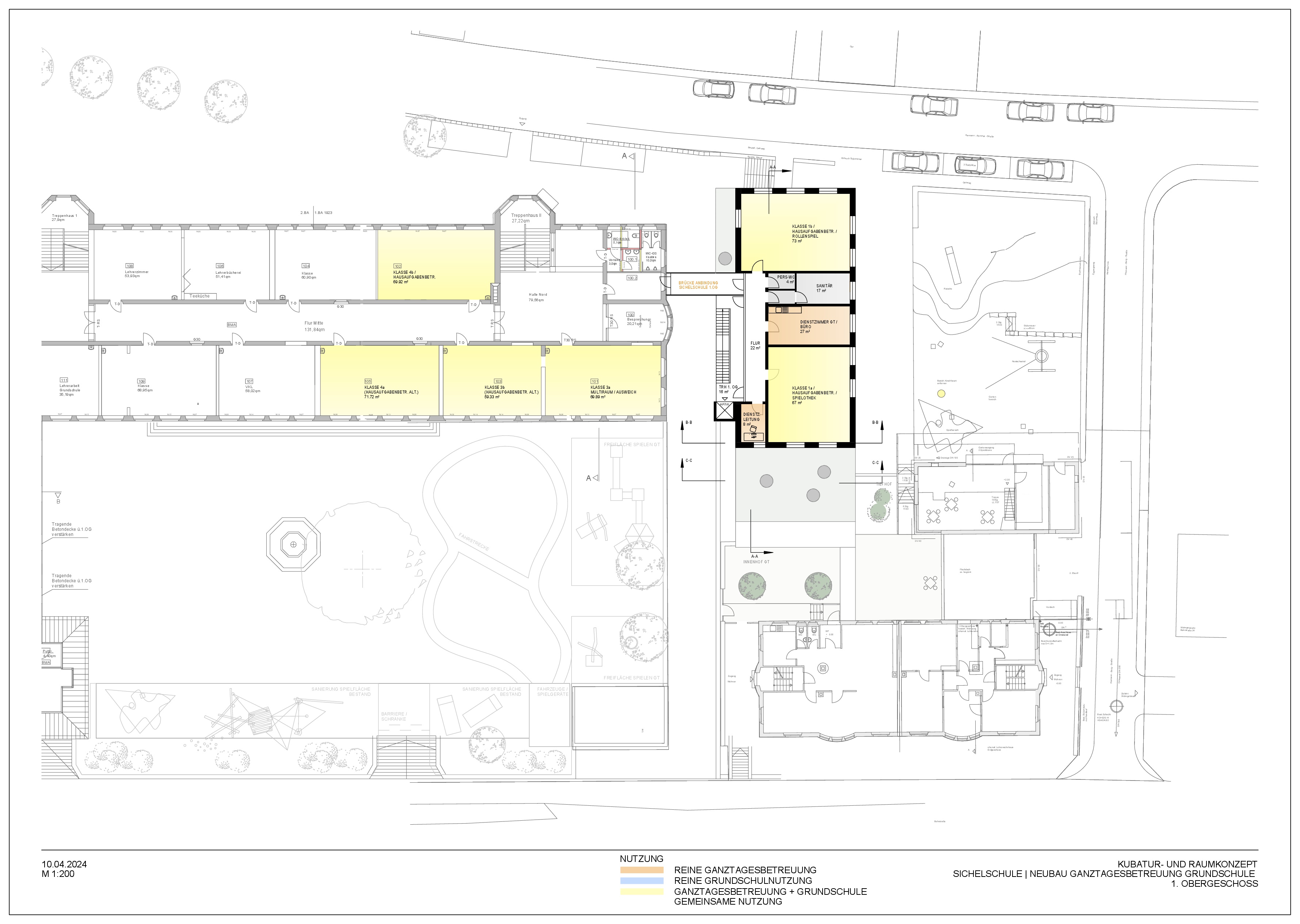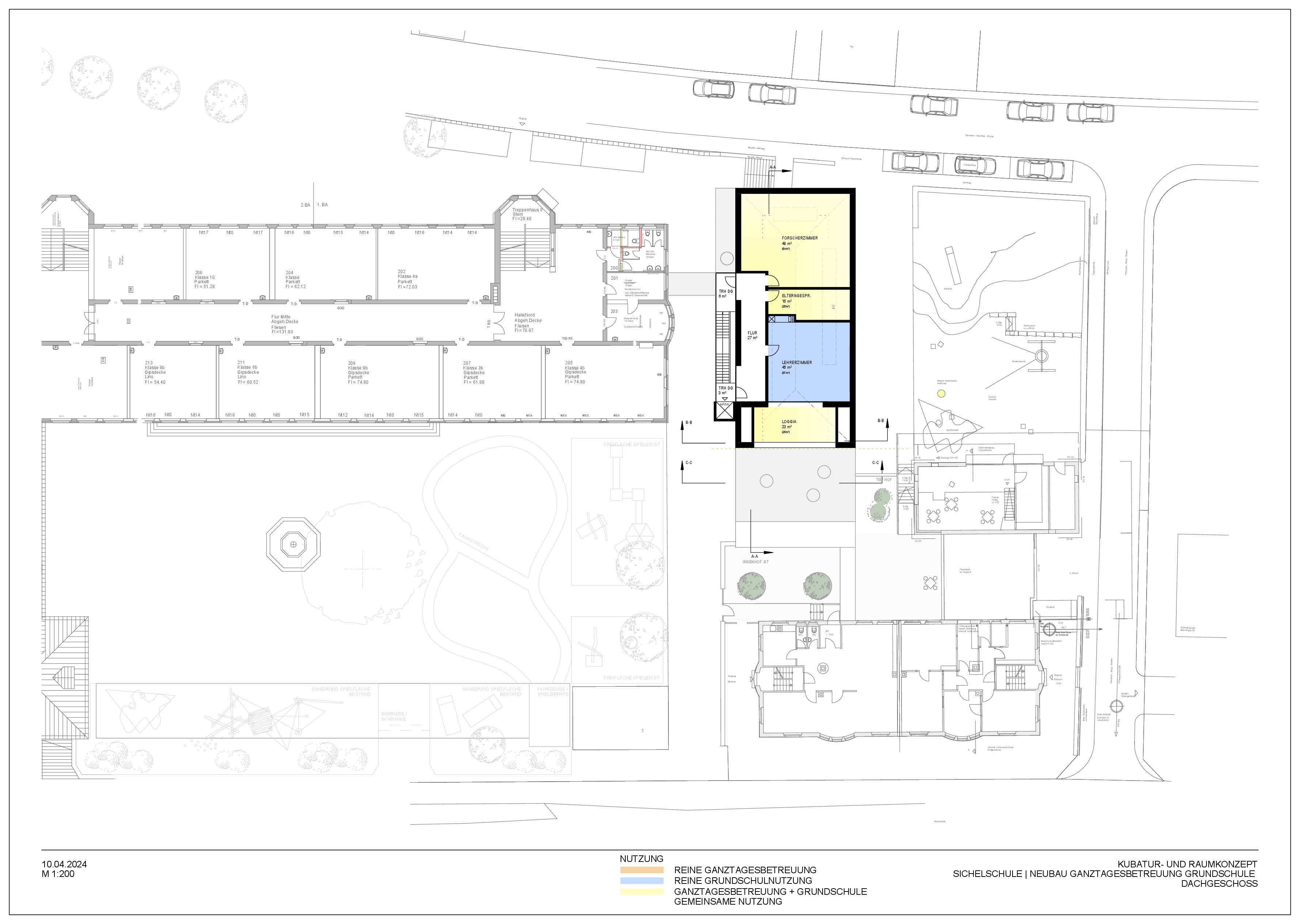 Auf dem Areal der denkmalgeschützten Sichelschule wird ein freistehender Neubau nördlich, zwischen Schulhauptgebäude und dem