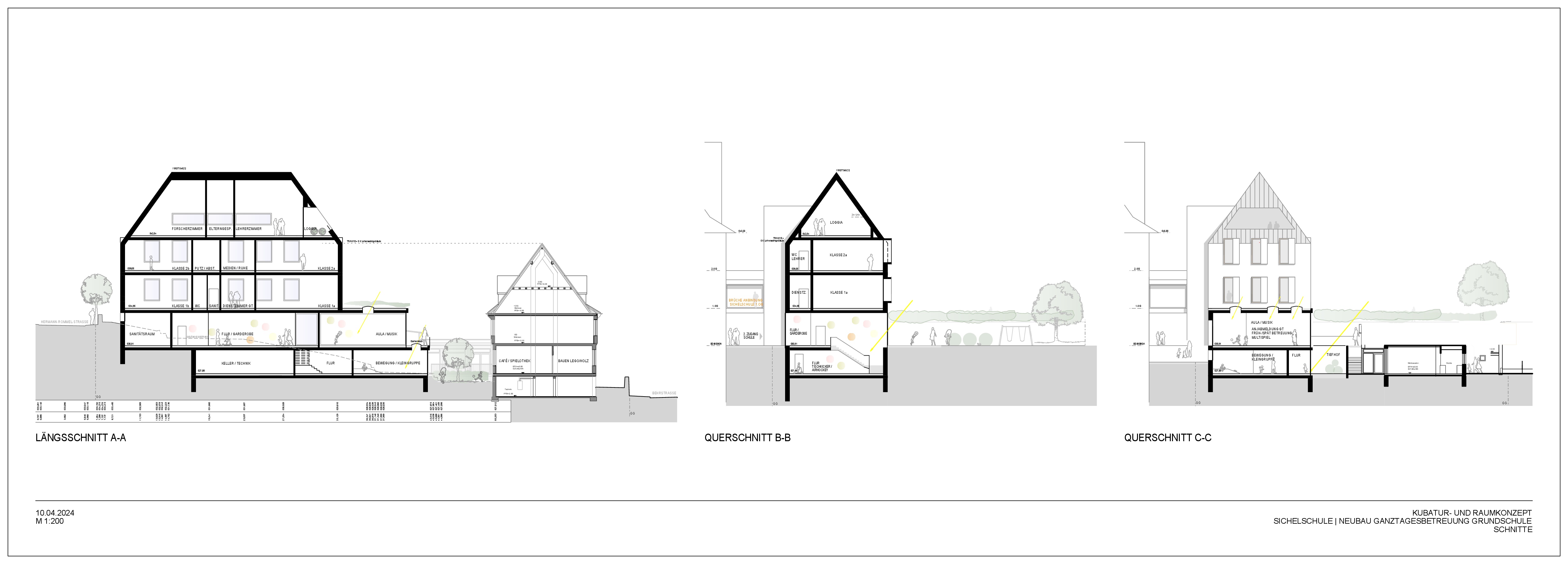 Der Neubau wird über eine Brücke in zwei Geschossen an das Hauptgebäude angebunden. Diese Verbindung schafft, über den Aufzug im Neubau, einen barrierefreien Zugang zu den beiden Obergeschossen der Sichelschule. Außerdem werden die bestehenden Betreuungsräumlichkeiten im Lehrerwohngebäude mit in das räumliche Konzept integriert und über den Innenhof überdacht angebunden.