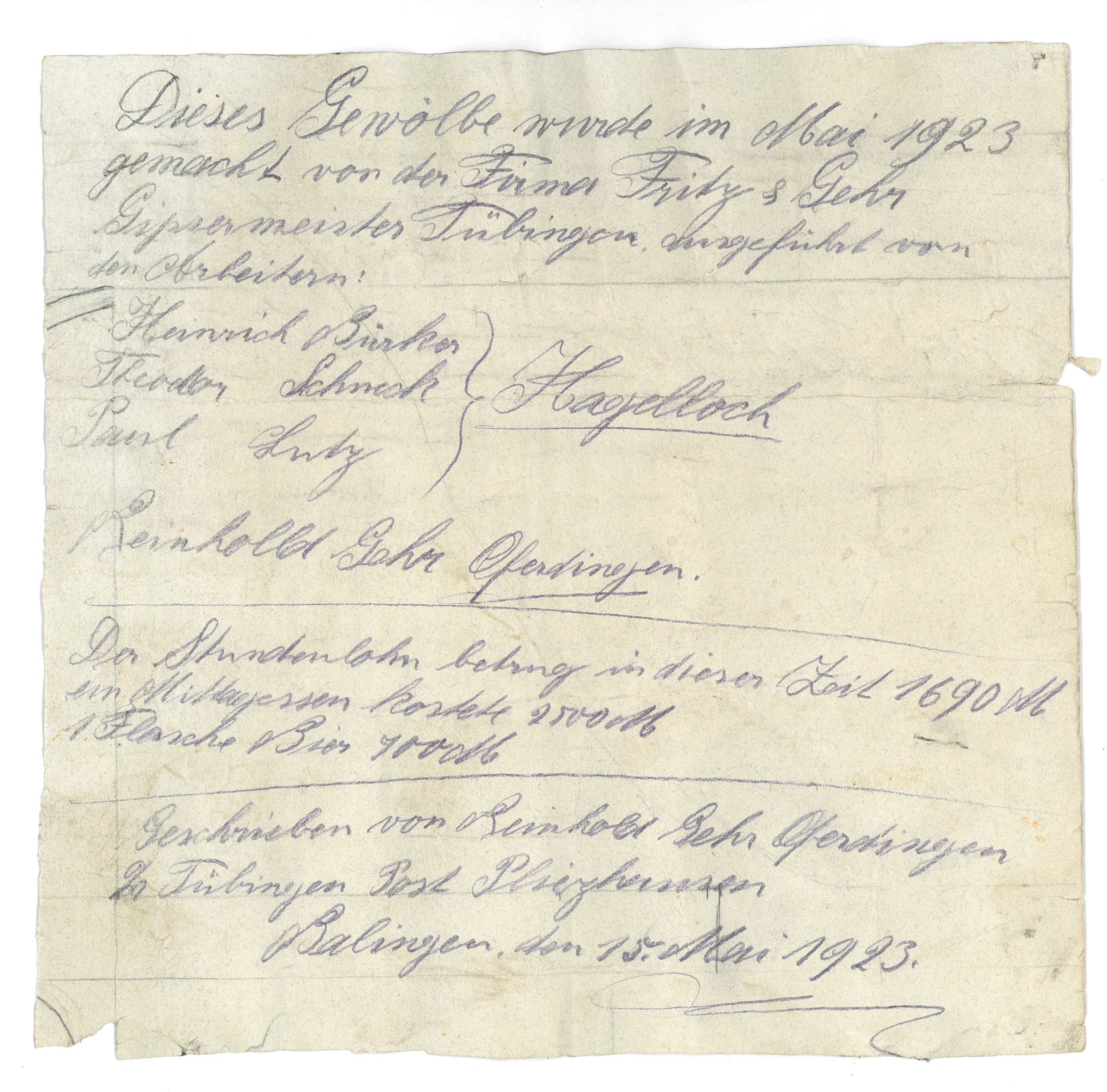 Reinhold Gehr notiert in der Nachricht, dass die Firma Fritz & Gehr Gipsermeister aus Tübingen den Gewölbekeller der Sichelschule im Mai 1923 erstellt haben. Auch gibt sein Schreiben Einblick in die damalige prekäre Wirtschaftslage. Im Inflationsjahr 1923 betrug der Stundenlohn 1690 Mark. Ein gewöhnliches Mittagessen kostete 2400 Mark und für 700 Mark konnte eine Flasche Bier gekauft werden. So sollte es einen auch nicht verwundern, wenn sich die Kosten des zweiten, südlichen Bauabschnitts der Sichelschule auf 1.963.222.252.874.261 Mark beliefen.