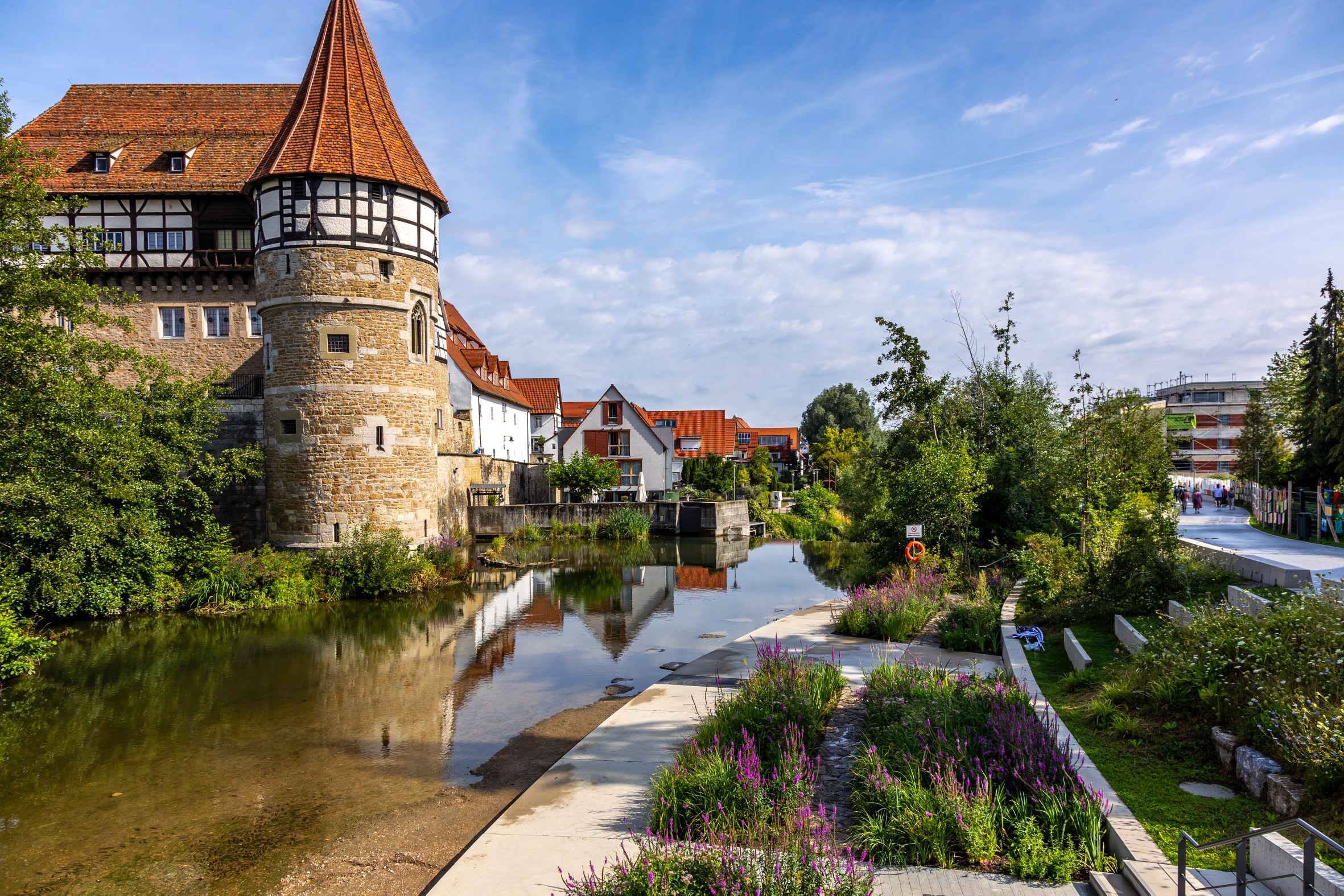 Mit Blick auf das Zollernschloss und Klein Venedig kann durch die begrünten Anlagen geschlendert oder auch ganz entspannt auf den Sitzblöcken ein Eis aus der nahegelegenen Fußgängerzone verspeist werden.
