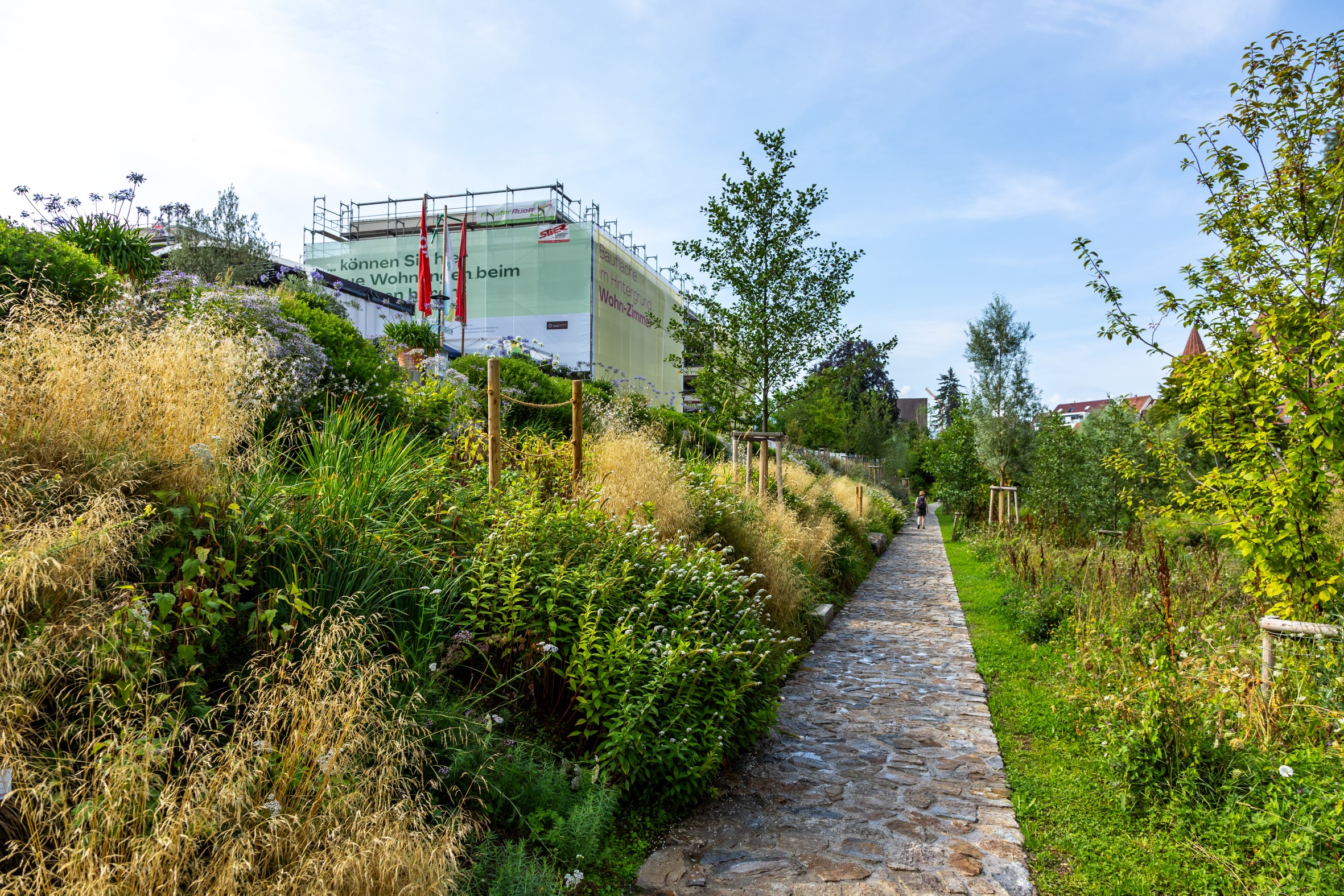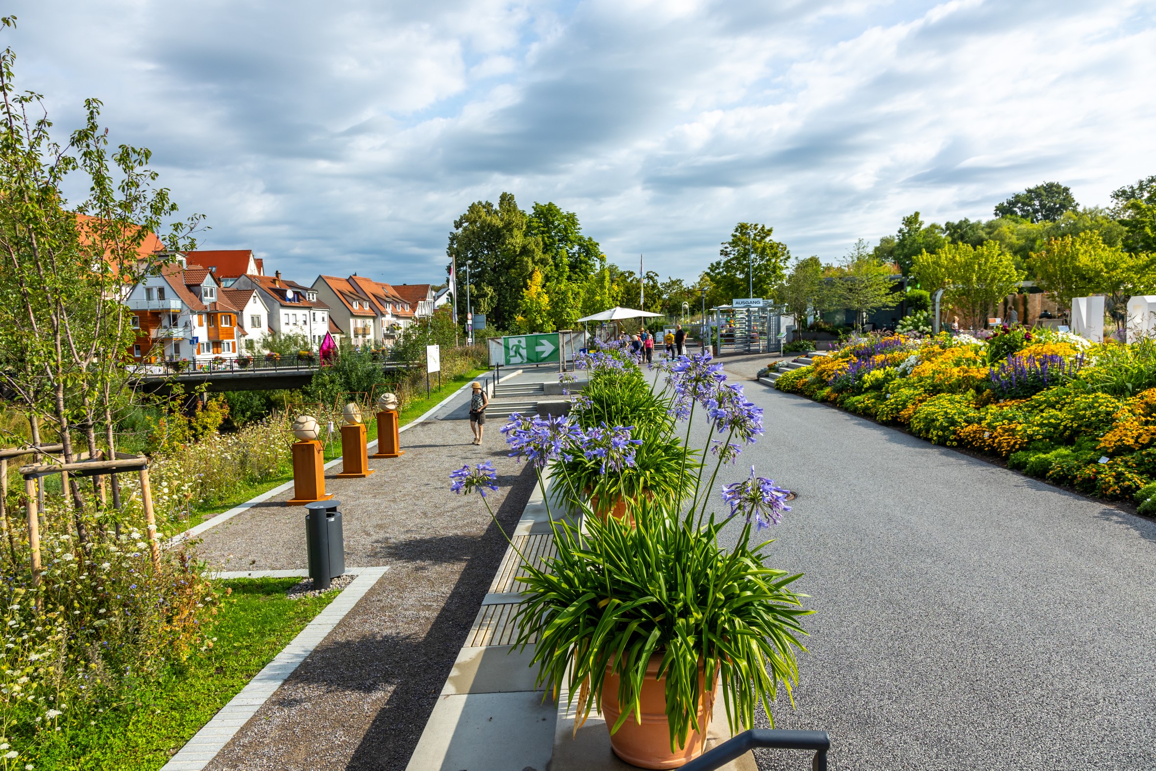 Das Wasser erlebbar zu machen war einer der wichtigsten Gestaltungsschwerpunkte der Balinger Gartenschau 2023. Die Eyachterrassen und Wassergärten bringen Sie direkt an die Eyach heran. Die beiden Bereiche bieten einen wertvollen innenstadtnahen Aufenthaltsraum direkt am Fluss – zum Eisessen, als Treffpunkt oder einfach nur, um am Wasser die Seele baumeln zu lassen.