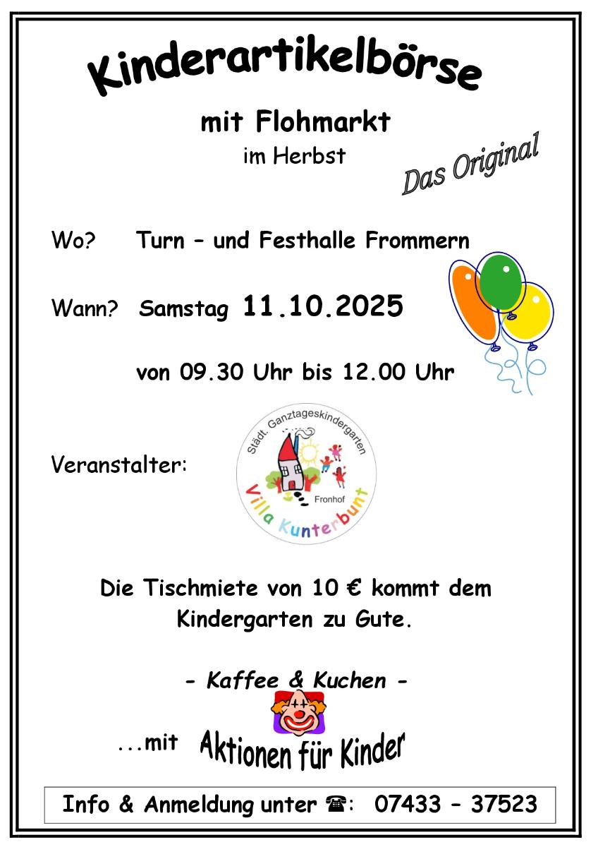 Am Samstag, 11.10.2025 veranstaltet der Kindergarten Fronhof zum wiederholten Mal seine Kinderartikelbörse in Frommern. Zwischen 09.30 Uhr und 12.00 Uhr dreht sich in der Turn- und Festhalle alles rund um das Kind. Verkauft wird Kleidung, Spielzeug zudem Flohmarktartikel aller Art. Neben Kaffee und Kuchen werden auch Aktionen für Kinder angeboten.