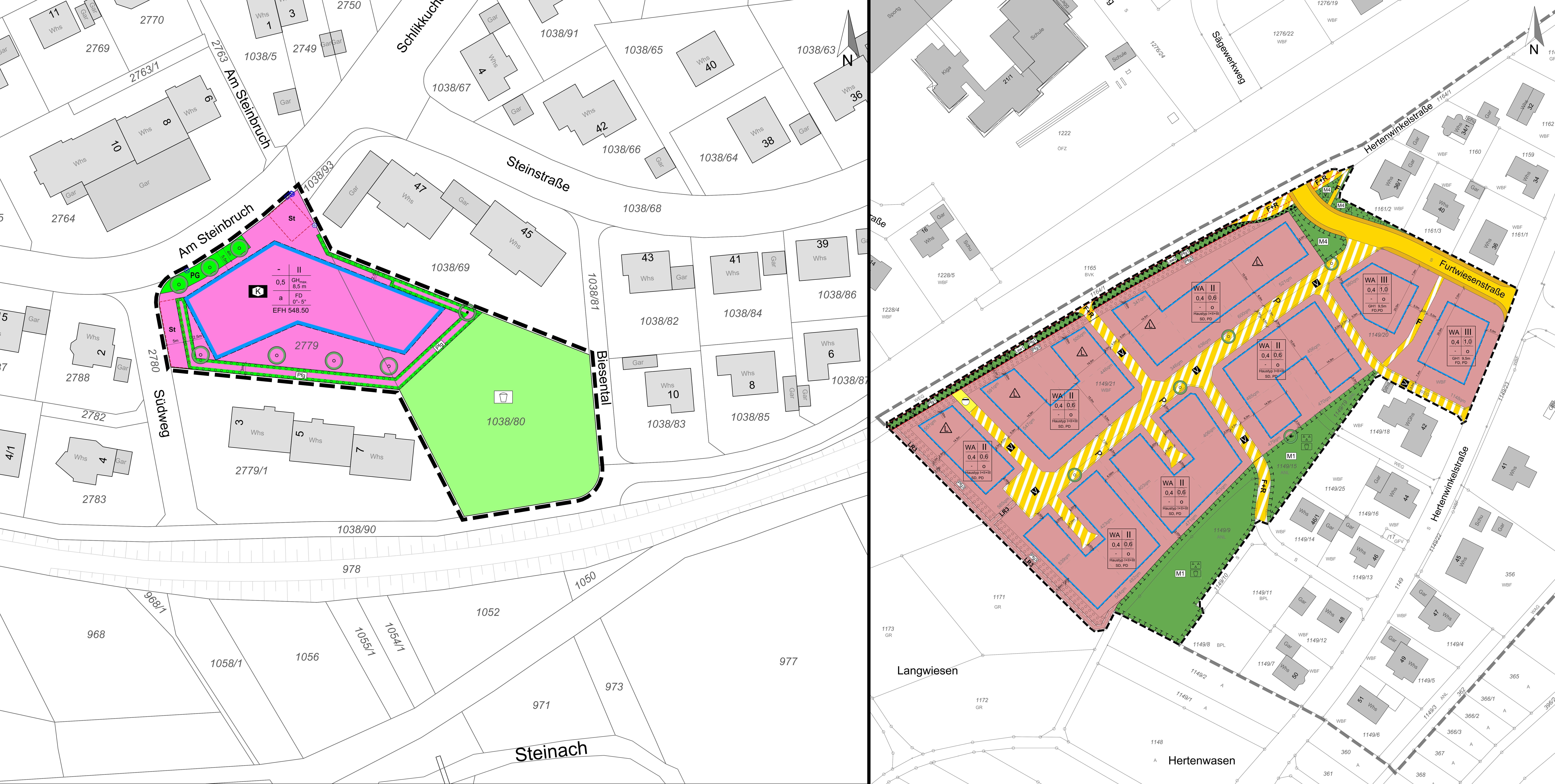 - Durch die Aufstellung von Bebauungsplänen für Teilgebiete der Gemeinde werden die Planungsabsichten verbindlich. Der Bebauungsplan (verbindlicher Bauleitplan) wird vom Gemeinderat als Satzung beschlossen und ist sozusagen ein Gesetz auf Gemeindeebene. Dadurch gelten für alle Bürger, die innerhalb des Geltungsbereichs eines Bebauungsplanes ein Bauvorhaben erstellen wollen, dieselben Vorschriften. Bebauungspläne dienen als rechtsverbindliche Grundlage zur Beurteilung und Genehmigung von Bauanträgen.